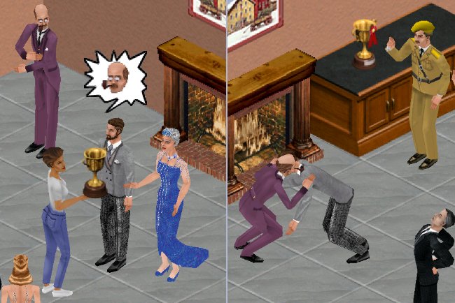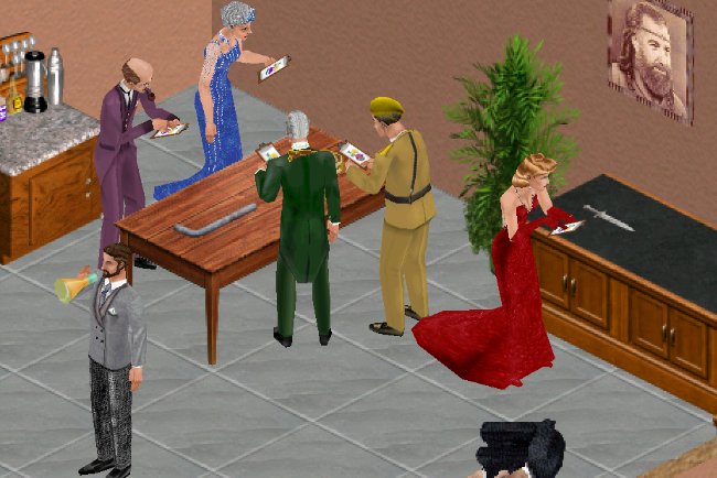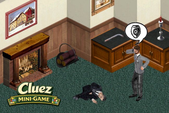 - Cluez Mini-Game (above ) – A whodunnit interactive mystery game spread across the house or lot. Sims compete with colorful NPCs to find clues, investigate evidence, question suspects, collect tokens, and solve the crime to find out who did it, and with what object. Gameplay settings include Easy, Moderate, and Difficult.