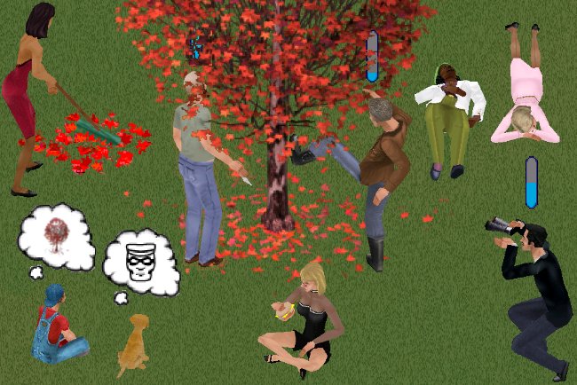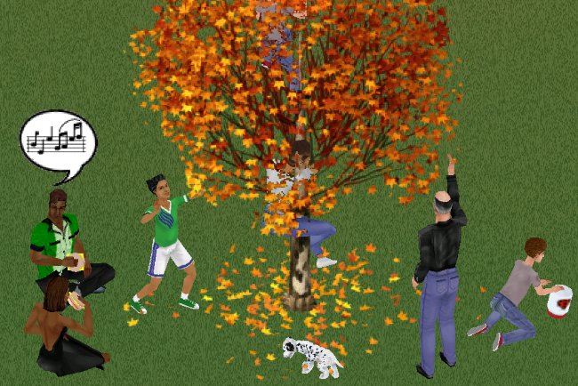 - Rake or Burn Leaves – Leaves can fall from the tree naturally, or if the branches are disturbed by excessive climbing or kicking. Leaf piles can be easily raked away, or safely burned (leaving no carbon footprint). Sims, neat visitors, or the gardener can tackle these tasks.